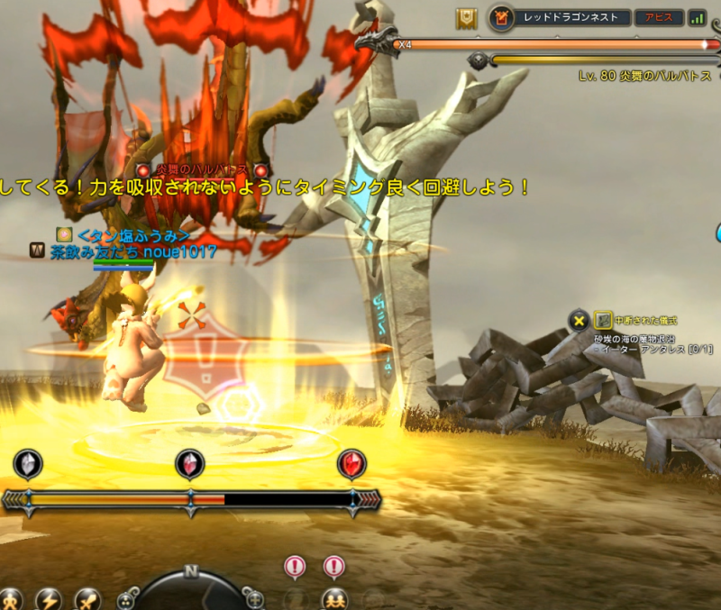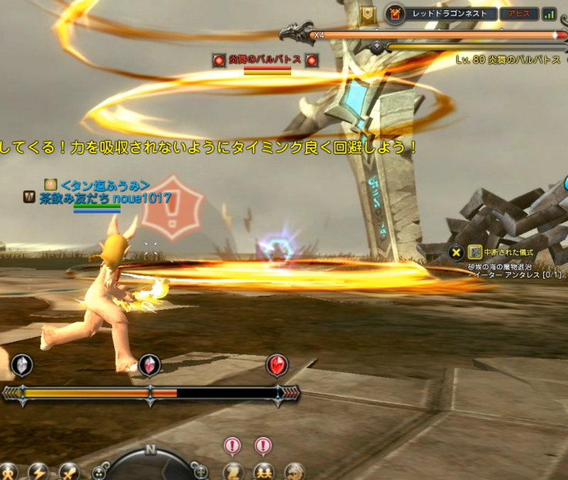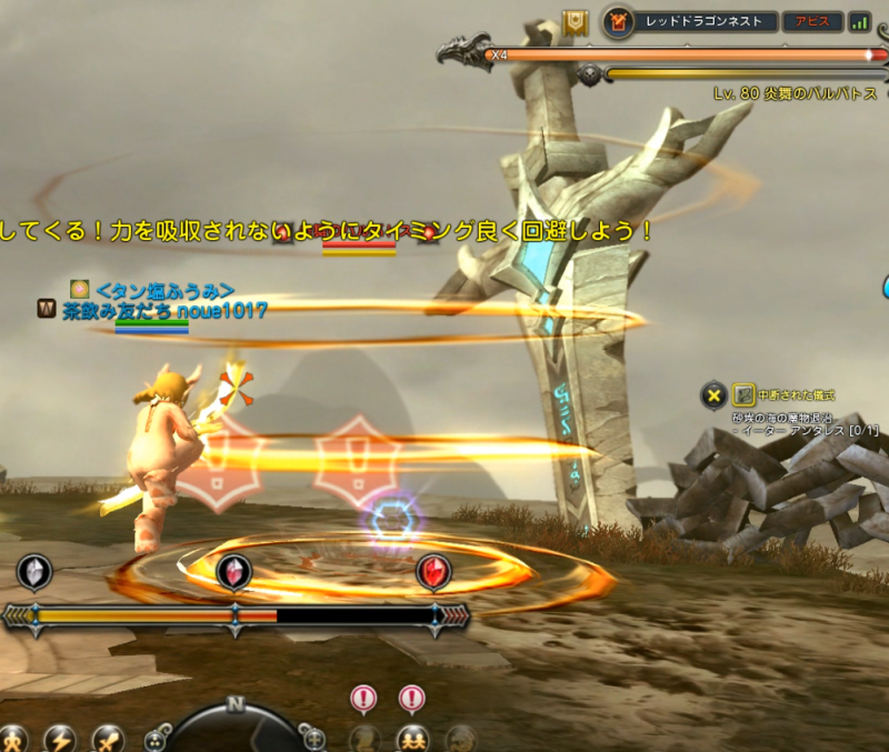 このときすでに敵(炎舞のバルバドス)が地面に降りる直前ですので、2個目が表示されてから敵のストンプまでは一瞬と思ってください。
